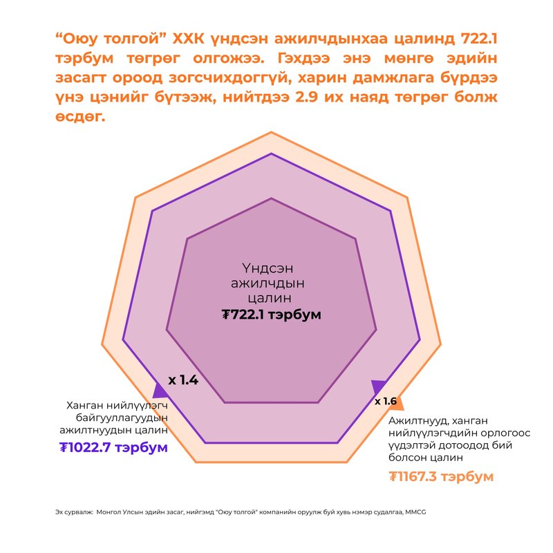 Нийт дүнгээрээ “Оюу толгой” компанийн үндсэн болон ханган нийлүүлэгчдийн цалин нэг жилд 1.7 их наяд төгрөг давж байгаа бөгөөд энэ их мөнгө дотоодын эдийн засагт янз бүрийн худалдан авалтаар дамжин давлагаалж, нэмэлтээр дахин нэг их наяд гаруй төгрөгийн цалинг бусад салбарынхан авах боломжийг үүсгэдэг байна. Ингэснээр Оюу толгойн үйлдвэрлэлийн шууд, дам, өдөөгдсөн нөлөөгөөр нийт 2.9 их наяд төгрөгийн цалингийн орлого бий болж байгаа нь Монгол Улсын нийт цалингийн орлогын 12.6 хувийг эзэлж байна.